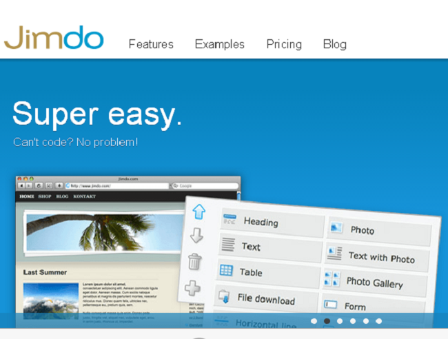 Jimdo cho phép bạn thiết kế website với tính năng phong phú, bao gồm thư viện ảnh và video. Chỉ mất 1 giờ bạn có thể tạo được 7 trang. Chúng tôi đã xem qua 120 mẫu và quyết định chọn 1 mẫu trong tổng số, sau đó thêm nội dung và ảnh hay giỏ mua hàng. Tiếp theo, chúng tôi đang ký tên miền Jimdo.com. Với những công cụ mà chúng tôi đã test, Jimdo cũng cho phép bạn đồng bộ hóa website với các thiết bị di động. Quyết định của chúng tôi? Nói chung là dễ dàng để tạo và nhiều sự lựa chọn hơn Sidengo, nhưng vẫn còn khá đơn giản.