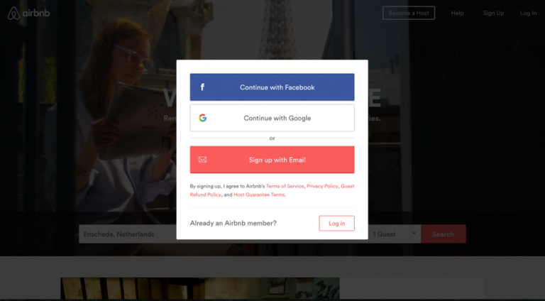 Điển hình là trang đăng nhập của Airbnb, bản thiết kế này có các phần nội dung được thể hiện nổi bật trên phần nền.